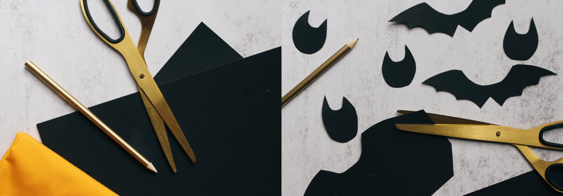 - Helyezd a sablonokat a fekete papírra, és rajzold körbe a denevér szalvétagyűrűket, a denevérszárnyakat és a denevérfejet. Ezután vágd ki a motívumokat.