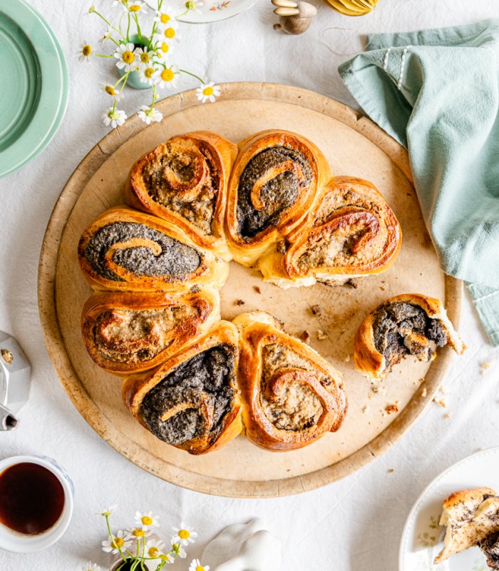 Finom mákos-diós virág friss vajas kelt tésztából. Különleges alkalmakra vagy meghitt kávézásokhoz is ajánljuk a mákos-diós virágot. Ez a látványos, mégis könnyen elkészíthető sütemény igazi középpontja lehet az ünnepi asztalnak. Családi összejövetelekre, ünnepekre vagy hétvégi sütéshez is tökéletes választás. A húsvéti ünnepi asztalról sem hiányozhat ez a gyönyörű sütemény. Garantált lesz a siker.